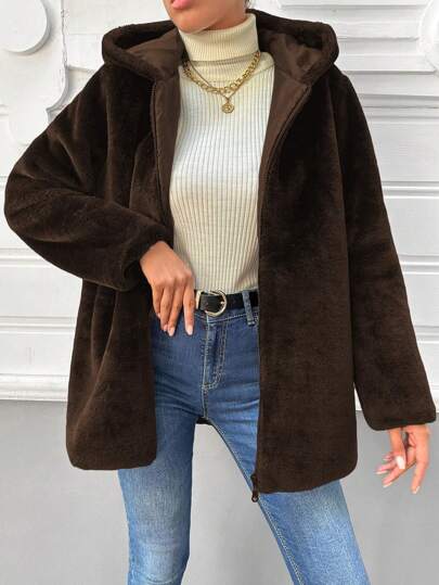 EURMUSE 拉鍊連帽毛茸茸外套 - 深灰色 - 查看 1