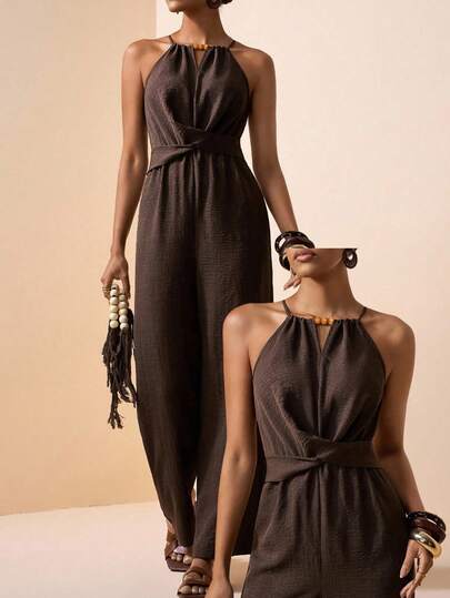 Zivah 2026春夏新款音乐节、复活节、圣帕特里克节、情人节、约会、西部风情、游牧风、生日派对、毕业典礼、大学、学生、日常休闲、百搭基础款、休闲、度假、邮轮旅行、海滩、日光浴、爆款、街头风、婚礼宾客波西米亚风、通勤、早午餐、机场、派对、假日郊游、办公装、露背褶皱交叉口袋阔腿亚麻棕色连体裤 - 棕色 - 查看 2