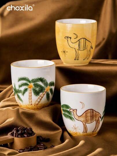choxila 1个沙特风格手绘椰树骆驼图案陶瓷咖啡杯,沙漠棕榈树茶杯,中东风格水杯,抹茶杯,奶茶杯,杯垫,咖啡杯垫,适用于家庭、接待处、餐厅、庭院