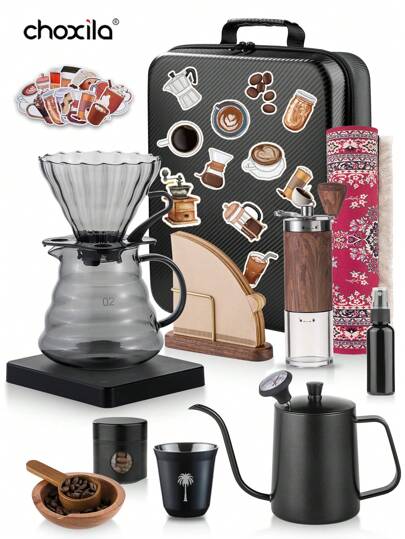 choxila 6/8/10/13/15件套手动咖啡机套装,含礼盒,适合派对和节日送礼,便携式咖啡礼盒,旅行咖啡配件,包含咖啡壶、温度计、带滤网的玻璃咖啡壶、椰子图案咖啡杯、咖啡滤纸和滤纸架、手动磨豆机、咖啡秤、咖啡勺、咖啡罐、喷雾瓶、咖啡豆托盘、咖啡垫、咖啡贴纸,返校季必备 - 黑色 - 查看 10