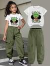 两件套少女休闲简约图案短袖圆领T恤和短裤套装,适合夏季,军绿色