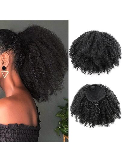 黑色短款波浪卷发马尾假发,抽绳设计,合成纤维材质,蓬松卷曲,适合非洲女性佩戴 - 黑色 - 查看 1