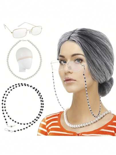 老婆婆假髮cosplay套裝,包含短髮捲髮奶奶,中老年肖像畫裝扮套裝,奶奶cosplay套裝,包括假髮帽,珍珠項鍊,眼鏡鏈,真實奶奶服裝假髮,萬聖節化妝舞會老奶奶套裝 - 灰色 - 查看 1