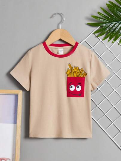 SHEIN 男孩休閒薯條印花t恤 - 卡其色 - 查看 1