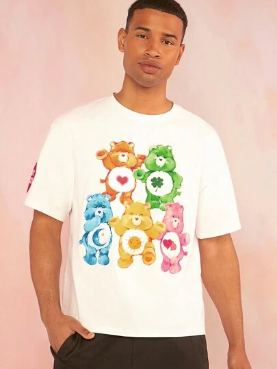 SHEIN X Care Bears 男士夏季卡通有趣多巴胺小熊圖案休閒寬鬆白色短袖T恤 - 白色 - 查看 1