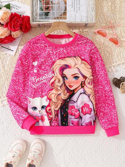 少女款漫畫貓印花長袖可愛卫衣 - 玫紅色 - 查看 4