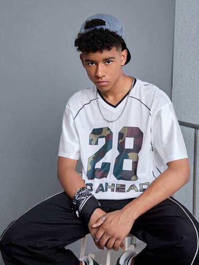 SHEIN 1入組青少年男孩時尚迷彩印花短袖棒球運動衫,適合街頭穿搭、夏季和運動 - 彩色 - 查看 6