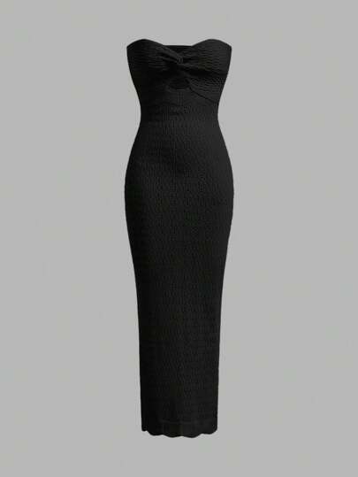 SHEIN Privé 女士优雅扭纹前钩针连衣裙、沙滩裙、钩针连衣裙,适合日常、约会和度假 - 黑色 - 查看 1