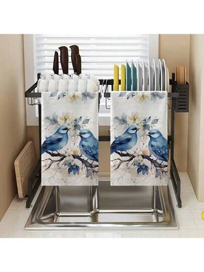 2 件装厨房毛巾,花卉和鸟类图案洗碗布 - 柔软吸水手巾,速干洗碗布,适用于厨房烘焙烹饪清洁、房间装饰、节日礼物 - 藍白色 - 查看 1