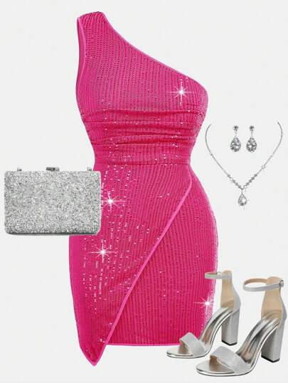 SHEIN 青少年女孩紫红色珍珠装饰优雅魅力紧身褶皱不对称迷你连衣裙 - 玫紅色 - 查看 1