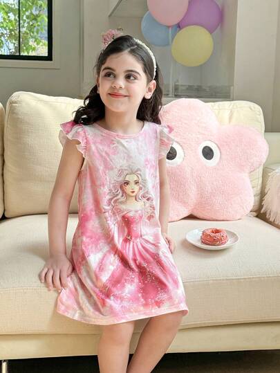 SHEIN Leap Crew 雪花公主印花女童睡裙舒适可爱风格无袖公主睡衣女童睡衣年轻女孩舒适家居服 - 粉色 - 查看 6