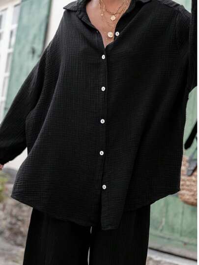 女式超大泡泡下摆中长袖纯色衬衫,适合搭配连衣裙、开衫或衬衫,情人节 - 黑色 - 查看 4