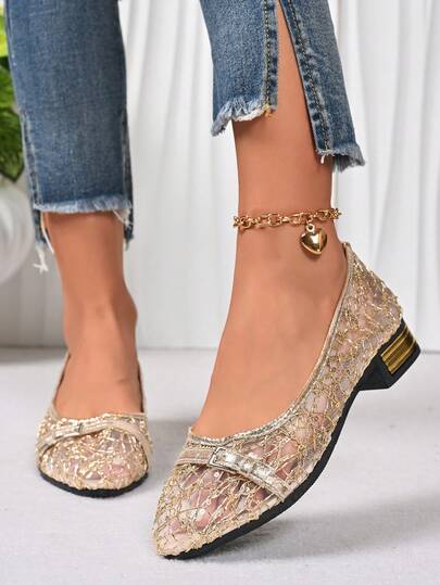 hanxiangyuzu 女士镶钻平底鞋,舒适方头芭蕾平底鞋,低跟礼服鞋,亮面平底鞋 - 金色 - 查看 1