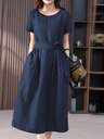 女士纯色中长款休闲短袖连衣裙,简约风格,适合春夏秋季
