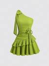 Sweetra Y2K性感不对称肩部度假风褶皱雪纺连衣裙