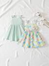 SHEIN 女嬰愛心圖案肩部蝴蝶結吊帶拼接連體衣洋裝和頭巾