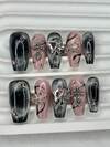 纯手工美甲套装,10片装,短梯形法式美甲,按压式美甲,持久耐用,优雅大方设计,凝胶甲油,猫眼效果,金属光泽,全覆盖假指甲片,镶嵌各种形状的3D大水钻和美甲宝石,套装包含1管果冻胶、1根美甲棒和1卷抛光胶带。美甲用品