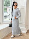 少女纯色长袖连帽口袋超长休闲卫衣连衣裙,带保暖内衬,加厚长款,适合秋冬季节穿着,毕业典礼、返校、冬季服装皆宜,灰色长袖连衣裙,女童运动连衣裙,休闲连衣裙