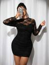 SHEIN ICON 大码黑色圆领长袖蕾丝扭纹前迷你紧身连衣裙,蕾丝迷你连衣裙,适合派对