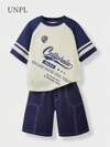 SHEIN Explorewe 2 件套男童休闲校园运动条纹字母印花短袖 T 恤搭配仿牛仔裤,适合春夏校园生活、户外活动