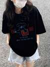 女士圆领短袖T恤,夏季新款卡通猫图案字母印花,时尚休闲百搭宽松上衣,黑色