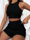 2件套女士纯色无袖背心和裤子度假复古风套装,适合夏季度假、商务通勤穿着,黑色