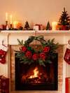 1 件人造圣诞玫瑰花环,配绿色蝴蝶结、逼真松针和铃铛饰物