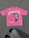 Manfinity EMRG 男士超大街头风格复古做旧涂鸦红眼文字万圣节 + 亡灵节印花洋红色落肩雪洗足球球衣风格 T 恤。