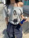 女士可爱卡通不对称领灰色T恤,独立美学宽松舒适休闲上衣,街头风