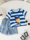 SHEIN 男女通用浅蓝色条纹小熊印花短袖T恤,婴儿针织上衣,春夏款