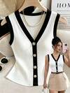 Franclia 女士优雅弹力罗纹黑白撞色V领收腰金属扣装饰背心,女士夏季服装,夏季上衣,嘉年华,节日服装,外套,优雅女士上衣,女士度假装,女士休闲装,白色上衣,黑白撞色,金属扣,时尚百搭