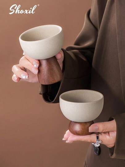 shoxil 1个陶瓷杯,带木底座,简约风格,可用作咖啡杯、茶杯、甜点杯、零食碗、坚果盘、首饰托盘、装饰品、烛台、香水杯,适用于餐厅、家居装饰、斋月及其他场合。