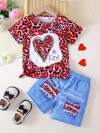 SHEIN 3件套女童休闲豹纹爱心花朵图案套装,字母标语印花T恤+短裤,适合小女孩夏季穿着,短袖儿童图案T恤套装,适合女孩夏季度假穿着