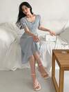 Rafferiza 优雅浅蓝色竖条纹方领露背收腰连衣裙