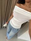 Glamine 女士透视褶皱露肩扭纹钩针编织 T 恤上衣,轻盈夏季/春季上衣,白色女士度假单肩上衣女士夏季服装适合外出度假和参加派对,性感优雅露肩女装领口编织扭纹褶皱 T 恤