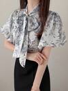 Franclia 女士法式精致浪漫梭织纯粉色短袖衬衫,系带设计,适合工作通勤、日常穿着,新款女士衬衫,优雅女士衬衫,女士休闲衬衫,女士休闲上衣,女士休闲,春夏女士衬衫,春夏新款女士约会衬衫。