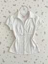 甜美女孩泡泡袖蕾丝边系带修身白色上衣