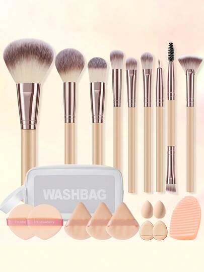 20 件套专业化妆刷套装 - 全套:9 支化妆刷(散粉刷、腮红刷、高光刷和眼影刷)+ 2 个美妆蛋 + 7 个粉扑 + 刷子清洁海绵,包含一个便携式字母化妆包 - 化妆工具套装。 - 彩色 - 查看 9